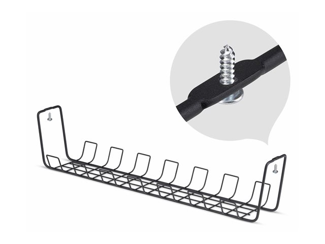 The StarTech.com cable management tray offers an effective solution to keep workspaces organized. Designed with a basket style and featuring a power bar holder, it ensures that cables are neatly stored and accessible. The tray mounts under the desk, saving valuable surface space and creating a cleaner look in any workspace. Constructed from durable steel with a powder coat finish, this cable tray is both sturdy and attractive, holding up to 5 kg of cables and equipment. The integrated cable management system helps reduce clutter, while the screw-on mounting method provides secure installation. Included in the package are 2 cable ties and 2 mounting screws, ensuring everything needed for a quick setup is provided.