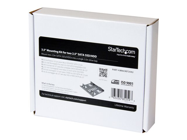 Mount two 2.5in SATA SSDs/HDDs into a single 3.5in drive bay. The BRACKET25X2 Dual hard drive mounting bracket kit lets you install two 2.5in SATA hard drives (HDD) or solid state drives (SSD) into a single 3.5in mounting bay - enabling you to significantly increase the performance of your desktop by adding the speed of a 2.5in SSD. Maximize the internal mounting space of your computer, by installing two 2.5in hard drives in the same 3.5in bay. The bracket can be used with SATA hard drives and solid states. For a hassle-free installation, the hard drive mounting kit includes all required data and power cabling for both SATA drives. Plus, the bracket can support IDE drives when using our 2.5in to 3.5in IDE Hard Drive cable adapter (IDE4044). The BRACKET25X2 features solid steel construction.
