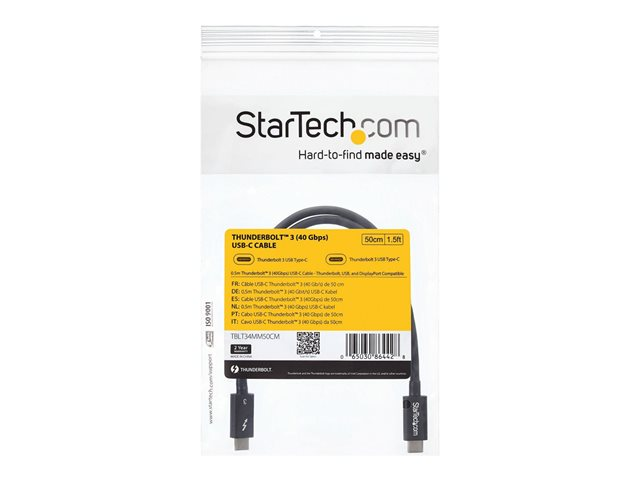 StarTech 50cm (1.6ft) Thunderbolt 3 Cable, 40Gbps, 100W PD, 4K/5K Video, Thunderbolt-Certified, Compatible w/ TB4/USB 3.2/DisplayPort