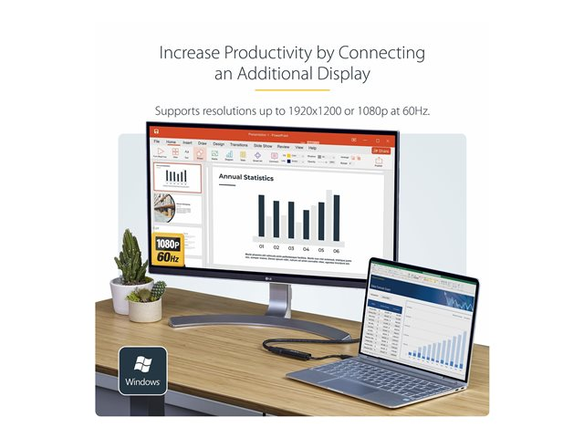 The USB32HDES slim USB 3.0 to HDMI adapter turns a USB 3.0 port into an HDMI output with 1920 x 1200/1080p video support. The adapter minimizes clutter with a slim design that seamlessly blends with your video cable - an ideal space-saving solution for multi-monitor applications on Ultrabook, laptop, or desktop computers. Functioning as an external graphics card, this USB to HDMI adapter provides a convenient way to add multi-monitor capability to a USB 3.0-enabled desktop or laptop computer (optimal performance from USB 3.0, backward compatible with USB 2.0). To save space while traveling, this ultra-portable USB to HDMI adapter features a lightweight, small footprint design that fits easily in a laptop carrying bag. Leveraging the high-bandwidth (5 Gbps) SuperSpeed USB 3.0 interface, the adapter delivers smooth, high-definition content to your HDMI display/projector. The adapter can be used to mirror your primary desktop, showing the same image on each display, or to extend your desktop to double your workspace and increase your productivity.