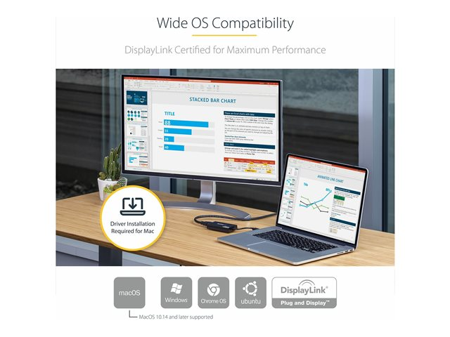 Want to add 4K Ultra HD video to your computer system? Now, you can enjoy the picture quality of Ultra HD video, even if your system doesn't natively support 4K video output. With an additional 4K monitor connected to your computer, you can extend or mirror your desktop for increased productivity. DisplayLink 4K Plug-and-Display certification ensures automatic driver installation, so you'll be ready to enjoy your Ultra HD display in no time. Now you can connect a 4K HDTV, monitor or projector to your computer, even if your laptop or desktop video card doesn't natively support 4K output. The USB32HD4K USB to HDMI 4K adapter lets you extend or mirror your primary display onto an Ultra HD monitor or television, giving you the additional screen space you need to simplify multi-tasking and maximize your productivity. At four times the resolution of high-definition 1080p, you'll be amazed at the picture quality of a 4K monitor or television; the USB32HD4K lets you harness the impressive bandwidth capability of a USB 3.0 connection to deliver the astonishing quality of Ultra HD to your 4K display. Plus, the adapter is backward compatible with 1080p displays, which makes it a great accessory for home, office or other workspace applications. Installation has never been easier. When you connect this DisplayLink 4K Plug-and-Display certified adapter to a web-enabled Windows 7, Windows 8 or Windows 10 computer, it automatically downloads and installs the most up-to-date drivers for you, so you won't have to.
