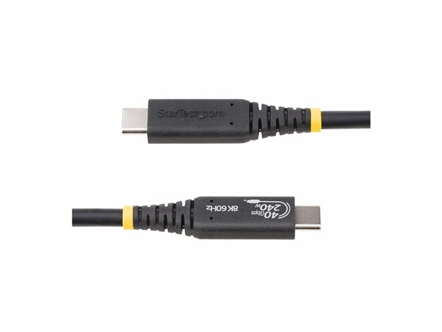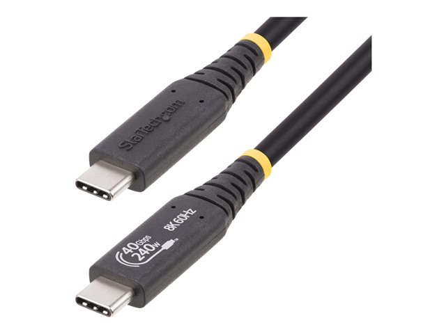 The 1 m (3.3 ft) USB4 Cable by StarTech.com is designed to offer high-speed data transfer and robust power delivery capabilities. This cable supports up to 40 Gbps data rates, making it ideal for transferring large files quickly and efficiently. With support for both 4K120Hz and 8K60Hz resolutions, it delivers video quality for an enhanced viewing experience. This cable is equipped with Display Stream Compression (DSC) for improved performance and HDR support, ensuring that your multimedia content is displayed with vivid colors and clarity. Constructed with premium materials, the USB-C cable features aluminum mylar foil shielding and braid for effective EMI protection. The e-marker chip integrated into the cable helps optimize power capacity and performance. Additionally, this cable supports Power Delivery 3.1, enabling up to 240 W of power transfer for fast-charging needs, along with support for up to 32 audio channels. Its halogen-free, thermoplastic elastomer jacket and nickel-plated connectors ensure durability and longevity, making it a reliable addition to any tech setup.