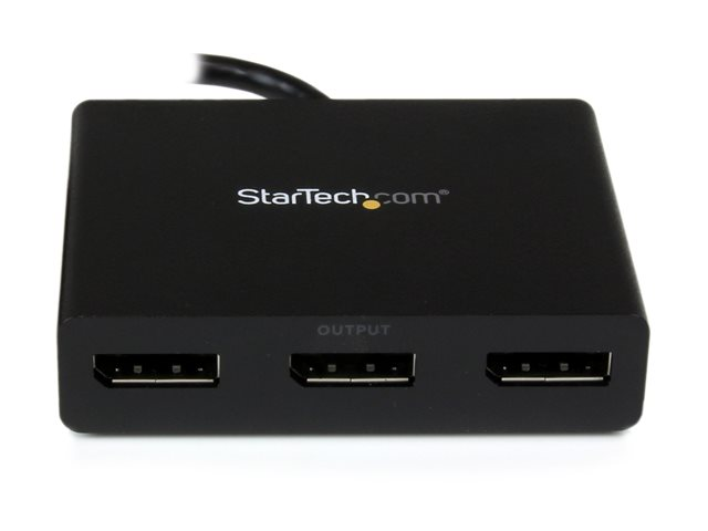 This MST hub lets you connect three monitors to your DisplayPort (DP) 1.2 equipped Windows laptop or desktop. The newest generations of computers are more portable than ever, which often means that you're left with fewer video outputs and smaller integrated screens. This MST hub solves both of these problems by letting you connect three additional displays to your computer, which makes multitasking much easier. With the MST hub, you can use DisplayPort video adapters and cable adapters that enable you to connect HDMI, VGA or DVI displays. This ensures your MST hub will be compatible with virtually any television, monitor or projector. This MST hub is VESA and DisplayPort certified to support DP 1.2 enabled systems, for seamless integration with your existing video equipment. Using the MST hub, you can extend your desktop onto additional monitors and stream independent content to each display giving you the freedom to multitask and increase your productivity. You can also mirror the same image onto multiple displays for remote viewing applications such as digital signage. MST technology uses your existing video card to minimize the use of system resources while delivering Ultra HD 4K resolutions. This unprecedented performance makes MST perfect for high-resolution applications such as graphic design, gaming and medical imaging. Note: When using a DisplayPort 1.1 video card the MSTDP123DP will act as splitter, automatically mirroring your video source across all displays. Resolution limitations apply. Note: MST shares 21.6 Gbps across all attached displays. Higher resolutions can restrict the available bandwidth with the remaining ports. Certain graphics adapters have limited MST support and will only output to three displays in total. If more than three monitors are attached the fourth will be disabled.