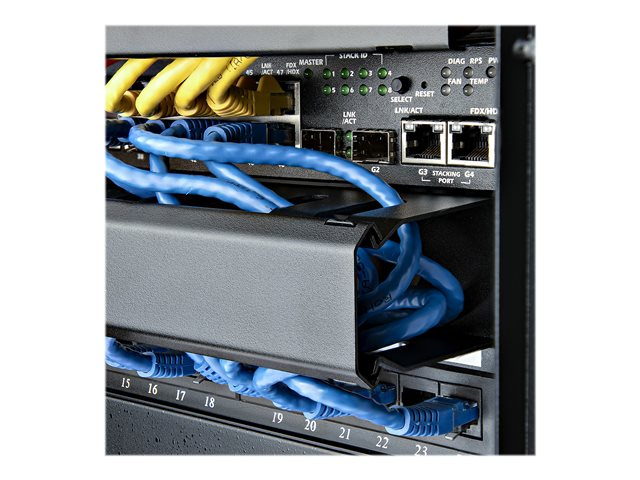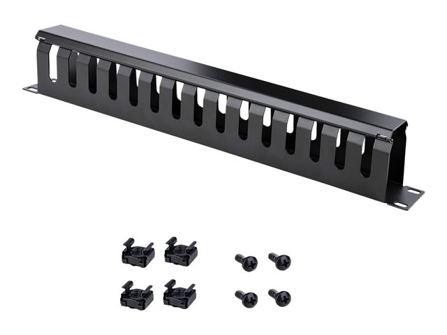 Organize cables in your server rack or cabinet with a horizontal, covered cable duct. The CMDUCT1UX 1U Finger Duct Cable Management Panel mounts to a standard 19" 2 or 4-post rack to help you organize horizontal cabling, through a covered cable duct. This TAA compliant product adheres to the requirements of the US Federal Trade Agreements Act (TAA), allowing government GSA Schedule purchases. The cable organizer features a removable top cover that makes it easy to add or remove bundled cables quickly. The duct also offers a series of fingers on either side, as well as pass-through holes at the back to help you route your cables where you need them, and reduce cable strain in the process. Made of high-quality steel, the cable manager is a durable solution for your server room or wiring closet. For easy installation, this horizontal cable organizer comes complete with 2 sets of rack screws (M5 and M6).