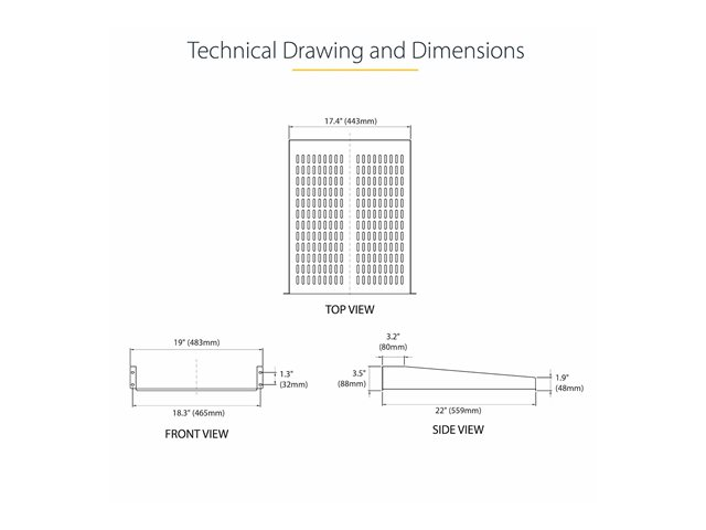Add a sturdy, 22in depth vented shelf into almost any server rack or cabinet. The CABSHELF22V 2U 22in Depth Vented Rack Mount Shelf lets you add a compact, 2U shelf to virtually any standard 19-inch server rack or cabinet with front mount options. This TAA compliant product adheres to the requirements of the US Federal Trade Agreements Act (TAA), allowing government GSA Schedule purchases. The vented rack shelves improve air flow and help to lower temperatures in the rack. Constructed using SPCC commercial grade cold-rolled steel, this durable fixed rack shelf can hold up to 22kg (50lbs) of equipment - a perfect solution for storing small, non-rackmount equipment, tools, peripherals or accessories in your rack to keep them readily accessible.