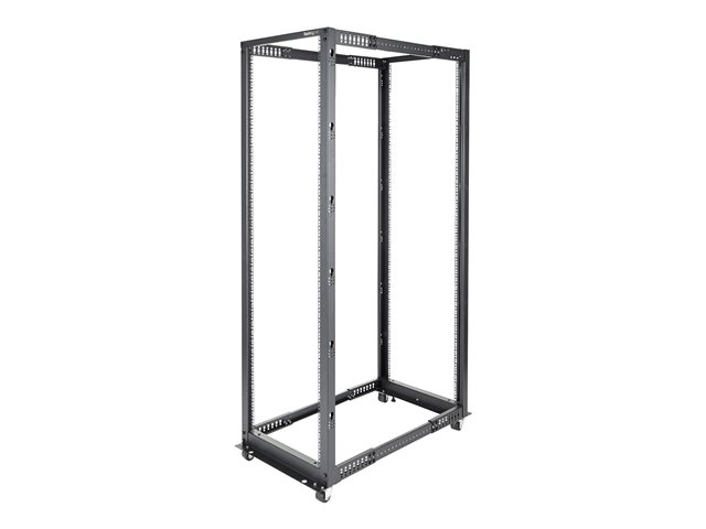 Store your servers, network and telecommunications equipment in an adjustable 42U open-frame rack. The 4POSTRACK42 42U Server Rack lets you store your servers, network and telecommunications equipment in a sturdy, adjustable depth open-frame rack. Designed with ease of use in mind, this 42U rack offers easy-to-read markings for both rack units (U) and depth, with a wide range of mounting depth adjustments (22 - 40in) that make it easy to adapt the rack to fit your equipment. This durable 4-post rack supports a static loading capacity of up to 1320lbs (600kg), and offers compliance with several industry rack standards (EIA/ECA-310, IEC 60297, DIN 41494) for a universal design that's compatible with most rack equipment. For a complete rack solution that saves you time and hassle, the rack includes optional accessories such as casters, leveling feet and cable management hooks. The base is also pre-drilled for securing the rack to the floor if needed, providing you with many options to customize the rack to fit your environment.