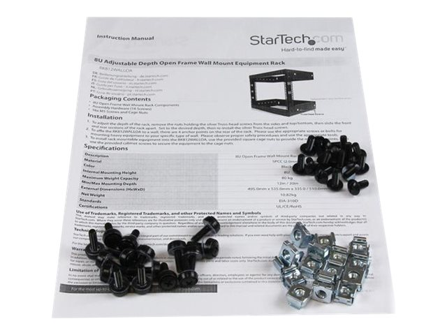 Mount your servers, network and telecommunications equipment in this 8U open-frame wall-mountable rack. The RK812WALLO 8U Open Frame Wall Mount Equipment Rack (12in Depth) is a high quality, low cost relay rack that is easy to assemble and install into any environment. The rack can be wallmounted or installed as a free standing storage solution. This TAA compliant product adheres to the requirements of the US Federal Trade Agreements Act (TAA), allowing government GSA Schedule purchases. Able to accommodate common networking, audio-video and telecom equipment, the open rack offers a depth of 12in; the wall mounts are positioned 16in apart (center to center), making it suitable for mounting on virtually any wall surface, based on North American wall frame stud spacing standards. This 8U rack can be mounted to the wall in a server room, office, or above a doorway, expanding your workspace and keeping your equipment easily accessible.