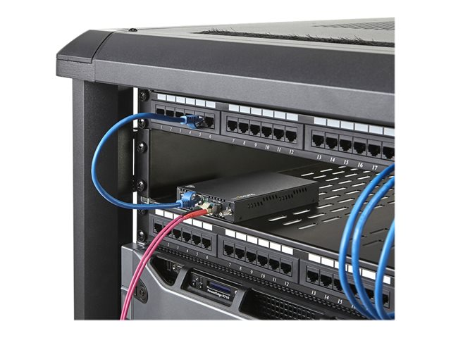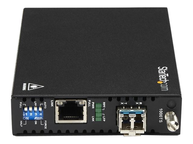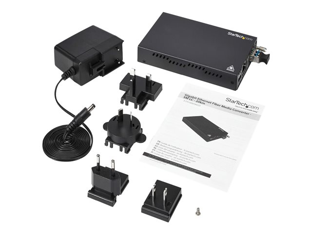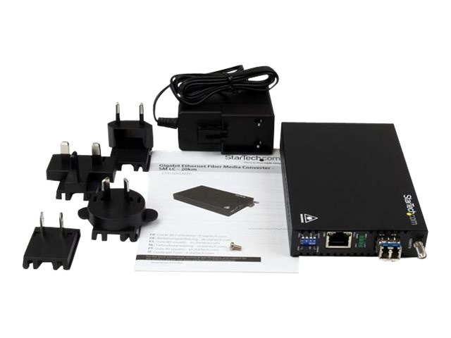 Convert and extend a Gigabit Ethernet connection up to 20 km (12.4 mi) using single-mode LC fiber cable. This Gigabit Ethernet to fiber media converter is a cost-effective way to extend your network, or extend the distance between two devices by up to 20 km (12.4 mi.). Fiber network connections provide greater distance and security, with less electromagnetic interference (EMI) than typical RJ45 copper-based networks, making it perfect for IT professionals and secure setups in government, business, or educational applications. This versatile copper-to-fiber converter supports standalone operation, or alternatively it can be installed into the StarTech.com Rackmount Chassis (ETCHS2U - sold separately), giving you more options for integration into your existing network. The card module can also be inserted back into the ET91000SM20 enclosure, plus it's compatible with enclosures from other StarTech.com ET91000 series media converters (sold separately). The converter features a pre-installed Gigabit SFP transceiver with LC connectors. Should your network infrastructure change in the future, you can easily swap and replace the module to adapt the media converter to your new network requirements. With flexible integration and connectivity up to 20 km away, you can provide network access to remote areas in other buildings, or in areas where Wi-Fi is unreliable or unavailable. This heavy-duty fiber media converter is designed for maximum reliability. It features a metal (steel) enclosure, so it can withstand the demands of harsh environments such as factories or warehouses. Plus, by relying on this more durable fiber media converter, you can reduce the strain on your existing copper-based network equipment and potentially extend the life of those devices, which helps save future expenses. This high-performance media converter supports a range of network setup and diagnostic protocols (for example, Link Fault Passthrough, Auto Laser Shutdown (ALS), and Auto MDIX, so you can set up and troubleshoot your network easily. If your existing network consists of RJ45 copper-based devices and cables, you might not be ready for future network expansion. Because the newest fiber-based network switches feature SFP ports more often than RJ45 ports, you might need a converter to bridge your copper and fiber networks together.