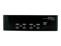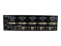 Share a keyboard and mouse as well as 1 VGA and 1 DVI displays/monitors between 4 multimedia computers. The SV431DDVDUA 4-port DVI VGA dual monitor KVM switch lets you control 4 Dual Display computers using a single USB mouse and keyboard peripheral set. This dual view KVM switch provides 1 VGA and 1 DVI-I port per computer connection for high-resolution video, as well as audio switching capability between connected computers. The DVI/VGA KVM switch features an integrated 2-port USB hub that allows USB 2.0 peripherals to be shared between connected computers, and offers a compact design with a rugged metal chassis for durable performance. NOTE: While both DVI-I (analog) and DVI-D (digital) are supported by the KVM, source PCs must output the same signal for proper switching. It is recommended wherever possible to use DVI-D cables across all PC to KVM and KVM to Console connections. If you'd like to mount this KVM switch to your server rack, StarTech.com offers a 1U Rackmount Bracket (sold separately) that turns this KVM into a rackmountable KVM.