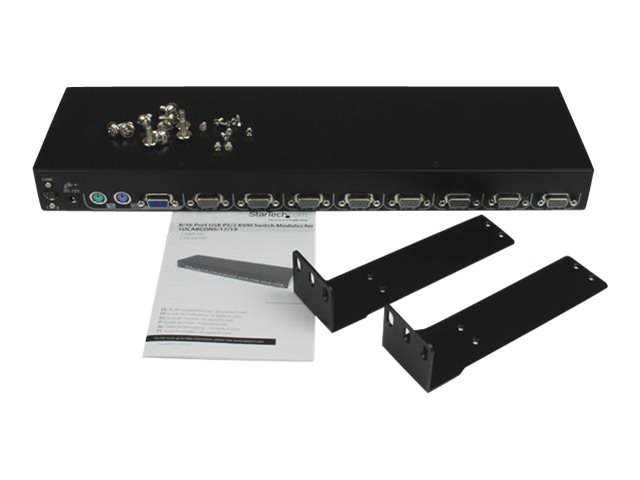 Enhance or replace the KVM module on your StarTech.com LCD console by controlling eight USB or PS/2 computers, or use with a separate PS/2 keyboard and mouse with VGA display. This 8-port KVM module works with the StarTech.com series of rack-mounted LCD consoles, enabling you to control eight servers from one location. You can upgrade a single port LCD console or replace a faulty console. With independent VGA and PS/2 keyboard and mouse ports, you can also use this switch as a standalone KVM, creating a discreet rack-mountable KVM solution. By adding this KVM module to your rack mount LCD console you can control eight individual computers or servers from a centralized location. Because the KVM module works with your existing LCD console, you can ensure simple integration into your server room setup. To ensure compatibility this KVM module supports any operating system has been extensively tested in Windows, Mac and Linux environments. You can also connect to both PS/2 and USB servers using StarTech.com's convenient line of interface specific KVM cables. The cables come in variety of lengths with PS/2 or USB depending on your specific server requirements.
