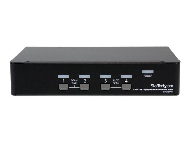 Share keyboard, mouse, and DisplayPort display between four HD multimedia systems. The SV431DPUA 4 Port USB DisplayPort KVM Switch with Audio combines next generation display standards with seamless KVM control of up to 4 connected PC or Mac computers. Featuring DisplayPort resolutions of 2560x1600 @60Hz, as well as offering both 7.1 HD digital audio (with supporting displays and sources) and separate 3.5mm stereo audio support. An integrated USB 2.0 hub allows you to share 2 additional peripherals among attached computers as if they were directly connected. Suitable for high quality static imaging applications such as health care (MRI, X-ray diagnostics, etc.), a maximum resolution of 3840x2400 is supported at reduced refresh rates. A simple yet comprehensive solution, the 4-port KVM features both front-panel push-button and hotkey switching, and offers a small form factor with rear connection ports, to minimize workspace disruptions. If you'd like to mount this KVM switch to your server rack, StarTech.com offers a 1U Rackmount Bracket (sold separately) that turns this KVM into a rackmountable KVM.