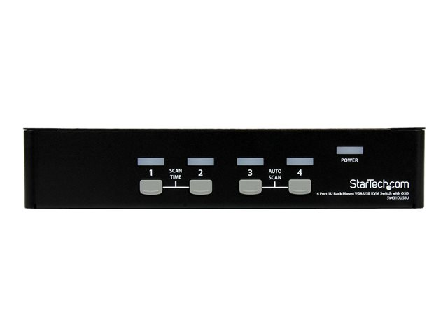 Control up to 4 VGA and USB computers from a single keyboard, mouse and monitor. The SV431DUSBU 4 Port 1U Rack Mountable USB KVM Switch with OSD lets you control multiple USB based computers from a single console (USB keyboard, USB mouse, monitor). Convenient push-button and hot-key controls provide quick, reliable switching between connected computers while manual and auto-scan switching modes and an On Screen Display (OSD) offer additional control options. Designed to ensure maximum space efficiency, the USB KVM switch features a slim 1U design that fits neatly into a server equipment rack/cabinet (with optional mounting bracket SV431RACK) and offers rear cable connections to eliminate cable tangles and minimize workspace disruption. If you'd like to mount this KVM switch to your server rack, StarTech.com offers a 1U Rackmount Bracket (sold separately) that turns this KVM into a rackmountable KVM. The SV431DUSBU only works with specific 2-in-1 VGA and USB cables (sold separately), a list of StarTech.com approved cables are below: 6 ft Ultra Thin USB VGA 2-in-1 KVM Cable; 6 ft Ultra Thin USB VGA 2-in-1 KVM Cable; 10 ft Ultra Thin USB VGA 2-in-1 KVM Cable; 15 ft Ultra Thin USB VGA 2-in-1 KVM Cable.