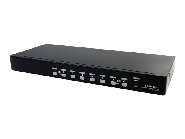 Control up to 8 VGA and USB computers from a single keyboard, mouse and monitor. The SV831DUSBAU 8 Port Rack Mount USB VGA KVM Switch (with Audio Cables Included) allows you to control up to 8 USB computers using a single keyboard, mouse and monitor, and features Audio and Microphone ports to switch between audio signals as well as PC ports. Based on a 1U rack mountable slim form factor design, this 8 Port USB KVM uses rear cable connections to maximize space efficiency. Multiple KVM units can also be connected (cascaded) together for control of up to 64 computers, ensuring a scalable KVM solution that can be expanded as necessary. To ensure seamless operation, the switch features automatic and manual scan modes, supports both hot-key and front panel push-button switching, and features a convenient OSD (on-screen display) for added configuration options.