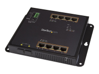 Add up to 10 different GbE devices to your network, using 8 RJ45 (PoE+) and 2 fiber-optic connections, with intelligent Layer 2 management. Easily deploy or scale your network with this Gigabit Ethernet switch, by adding eight copper Gigabit Ethernet ports (PoE+) and two fiber-optic SFP slots. This IP30 industrial network switch provides intelligent Layer 2 management. Its rugged, compact design and wall-mount option with front access make it ideal for demanding applications, even where space is limited. This versatile switch adapts to your network needs by providing two open SFP slots and eight RJ45 Ethernet ports (PoE+), providing both fiber and copper connections in a single network device. The MSA compliant SFP ports are compatible with 100/1000Mbps networks. The network switch enables you to connect up to eight RJ45 PoE+ devices, so different users can share files and devices, such as printers and scanners, over a LAN connection. Dual power input (terminal block and DC plug) provides flexible power options. The switch gives you the freedom to place your equipment in locations where power outlets are not available, with support for Power over Ethernet Plus. The network switch provides abundant PoE power, with up to 30 watts for each PoE port (200W budget). Wall-mount the compact Gigabit switch to provide convenient front access to ports and indicators. It's ideal for a wide range of applications, including tight installation areas with significant electromagnetic interference, such as control cabinets and panels. The network switch is also DIN-rail mountable. The switch delivers efficient and stable performance, with Layer 2 management capabilities. This lets you control packet traffic on a busy network, and customize your settings to achieve optimal network performance, offering improved efficiency and reliability. This rugged network switch features an IP30-rated metal housing and extended temperature range of -40°C to 75°C, which makes it ideal for a wide range of operating conditions. The sturdy metal enclosure offers durability, even in harsh industrial environments. With support for 10/100/1000Mbps transfer speeds, this managed switch supports full/half-duplex auto-negotiation, jumbo frames and auto MDI/MDIX operation. This lets you connect your network devices quickly and easily, with little to no configuration required.